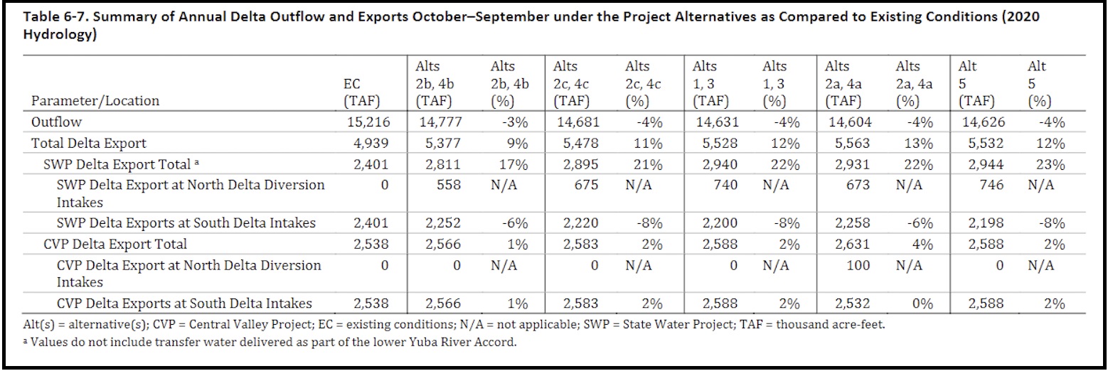 As the table below shows, the preferred alternative (#5) would increase Delta exports, compared to the 2020 water year, while reducing outflow toward San Francisco Bay.