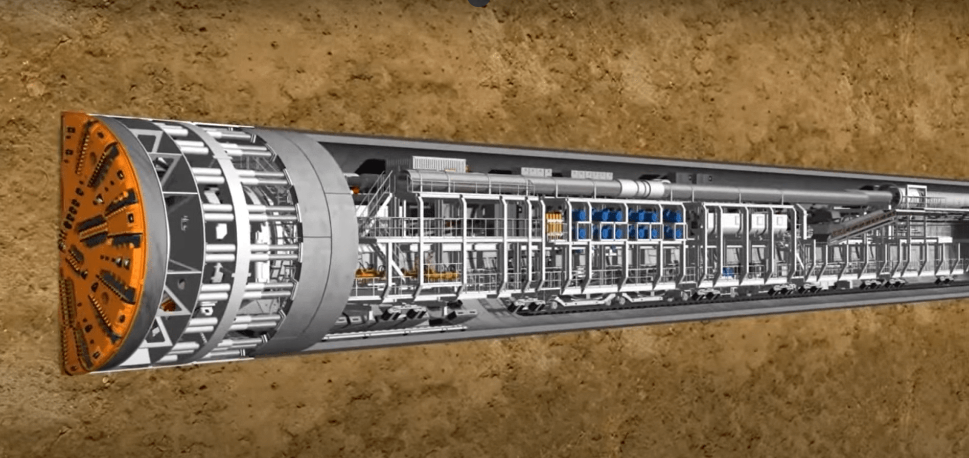 While operating, the TBM uses water and foam to cool the interface and soften the excavated material so it can flow through the head of a rotating augmented screw that moves the material onto a conveyor belt that transports it to the surface for storage.